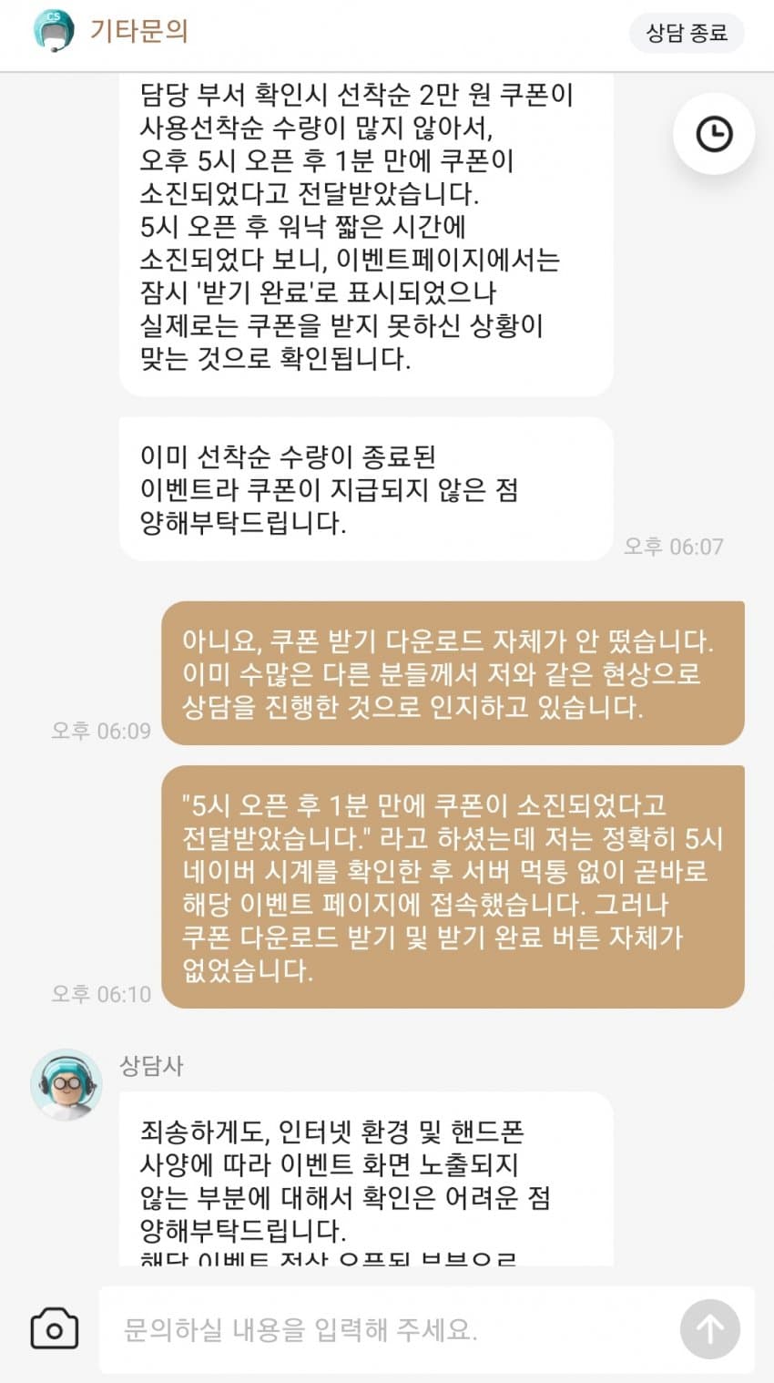 선착순쿠폰 못받은것에대한 보상(?)쿠폰 달라고 요구