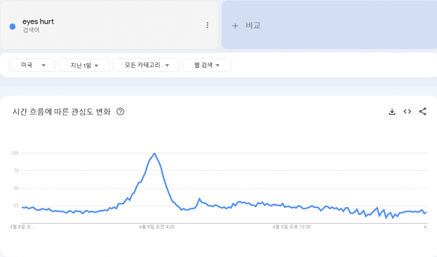 수상하게도 마침 일식이 있었던 시간대에 '눈 통증', '눈 아픈 이유' 따위의 검색어 검색량이 급증함....