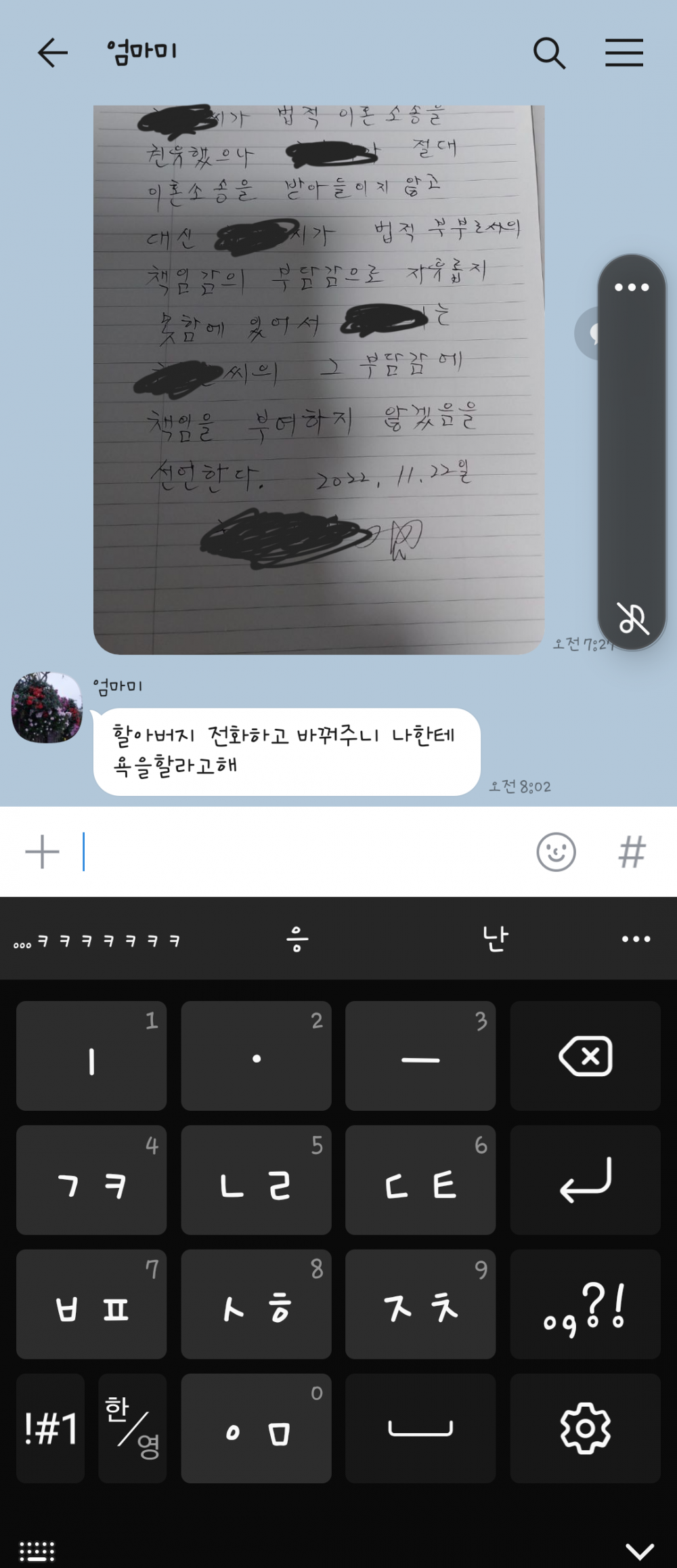 물론 엄마한텐 생활비 한 푼 없고인간적으론 진작 이혼했어야 마땅하지만 그래도 믿는 사람들이니까 아빠 불쌍해서 얘기도 들어주고 필요한거 있으면 오히려 도왔음