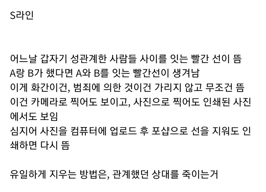 저 붉은 선을 지우는 방법은 상대를 죽이는거 포함해 그냥 상대가 어떤방식으로 죽으면 선이 사라짐(자살도 포함)
